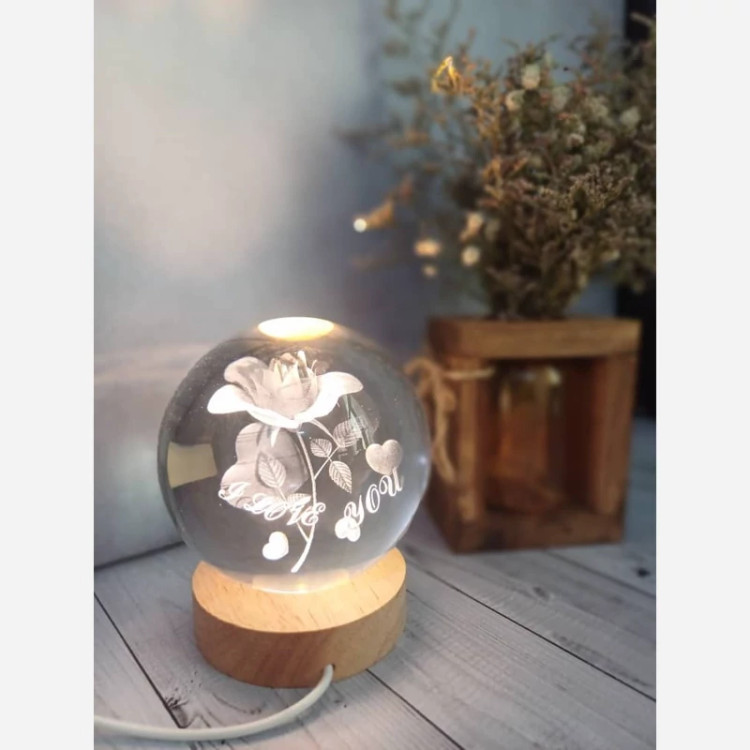 چراغ خواب گوی کریستالی طرح عاشقانه گل رز بانوشتهILOVEYOU